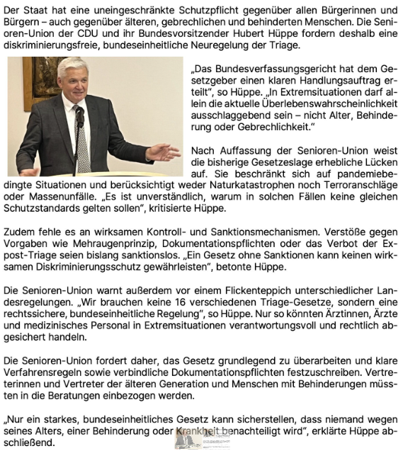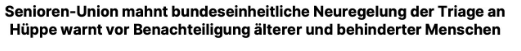 Senioren-Union mahnt bundeseinheitliche Regelung zur Triage an